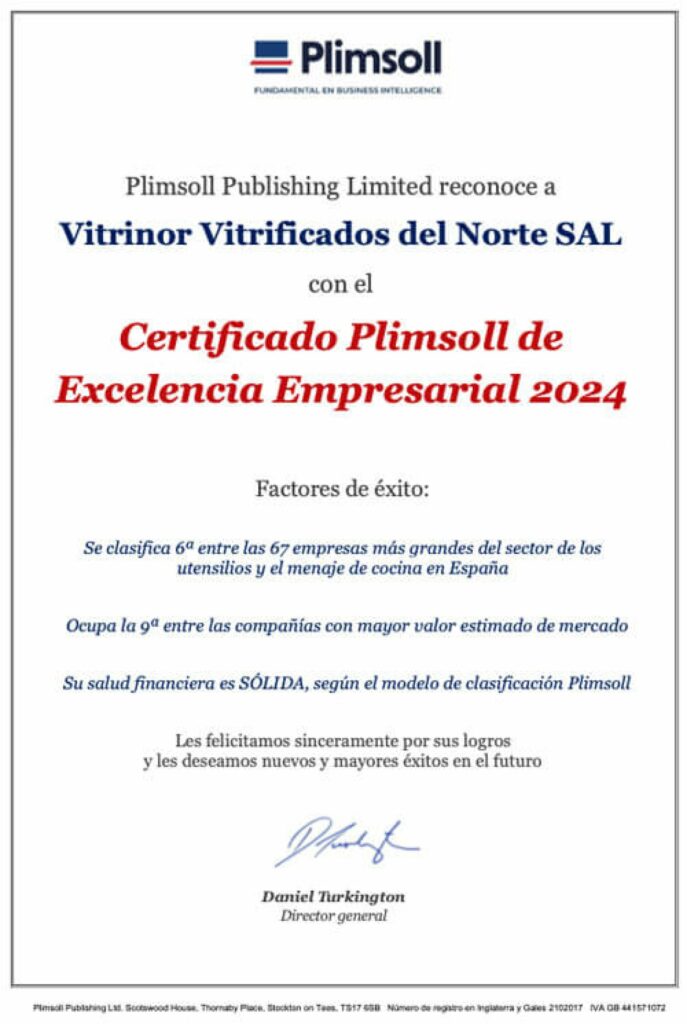 Por este motivo, Vitrinor Vitrificados del Norte SAL ha sido distinguida con el premio Plimsoll 2024, en reconocimiento a su notable labor, rendimiento y excelencia empresarial.