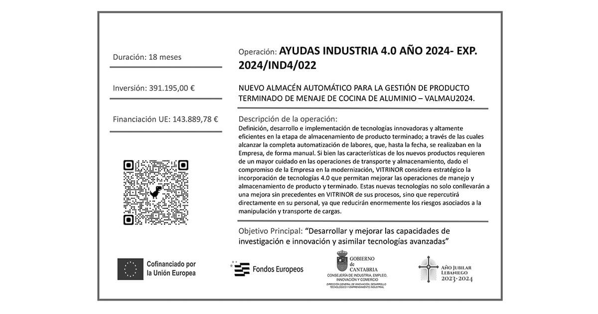 Vitrinor ha sido beneficiaria de una nueva ayuda dentro del programa de Ayudas Industria 4.0 del Gobierno de Cantabria, en su convocatoria de 2024