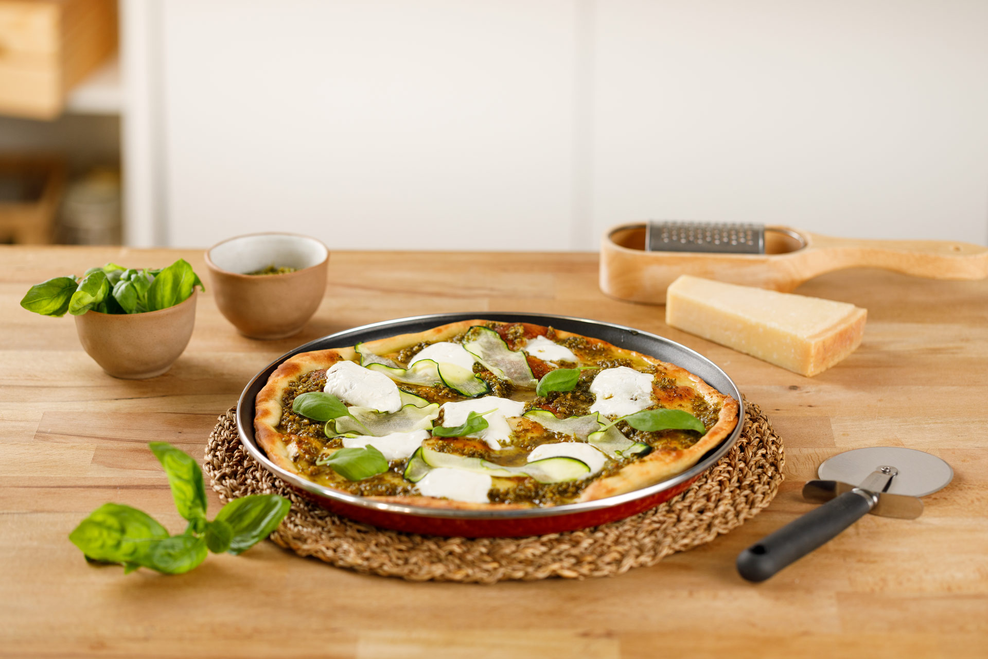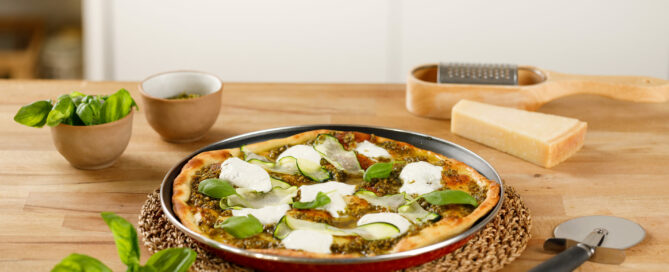 Pizza de pesto, burrata y calabacín. Una pizza diferente, con una capa vegetal muy ligera, perfecta para preparar en casa con el pizzapan de Vitrinor.